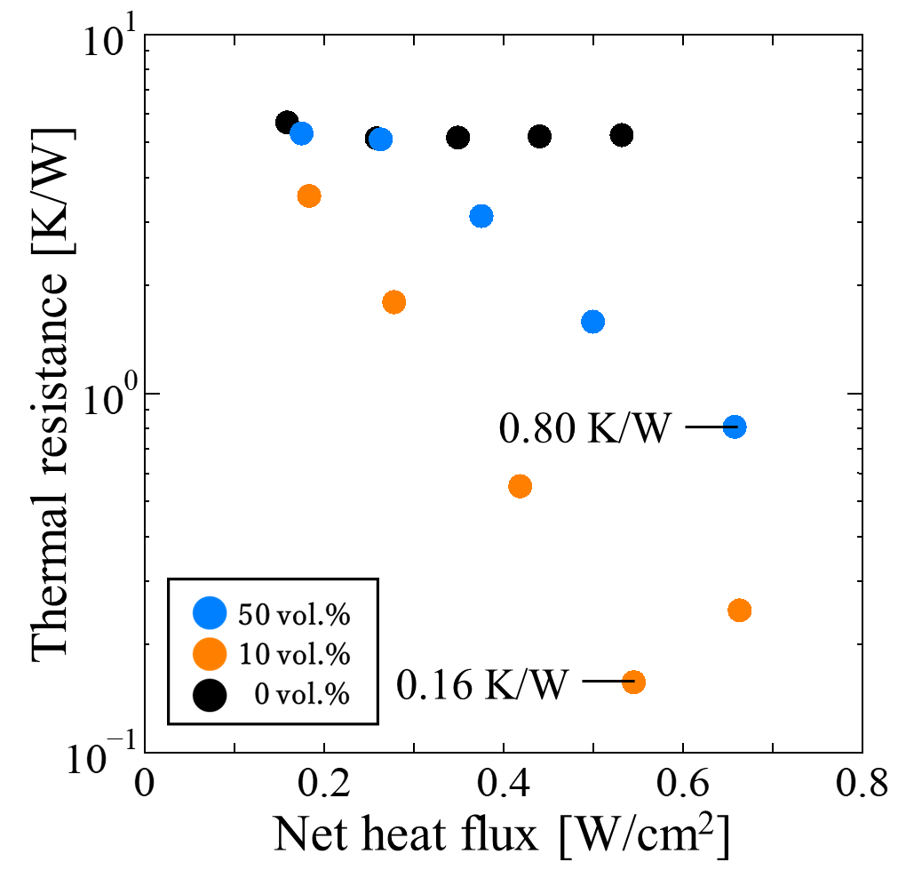 Figure 7 presents the thermal resistances at each filling ratio, with the horizontal axis representing the net heat flux. The results show that, for all heat inputs, the thermal resistance at 10 vol.% was lower than that at 50 vol.%. The minimum thermal resistance at 10 vol.% was 0.16 K/W, which represents a reduction of approximately 80% compared with the minimum value of 0.80 K/W obtained at 50 vol.%.
