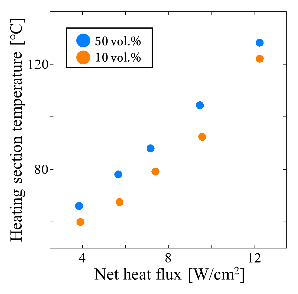Figure 11 shows the heating section temperatures at different filling ratios under water cooling. The cooling water flow rate was 217 mL/min for the 10 vol.% case and 229 mL/min for the 50 vol.% case. The horizontal axis represents the net heat flux. Similar to the results under forced air cooling (Section 3.2.1), the heating section temperature at 10 vol.% was consistently lower than that at 50 vol.% over the entire range of heat inputs, indicating superior heat transport performance at the lower filling ratio. This tendency suggests that, at 10 vol.%, latent heat transfer associated with phase change dominated the heat transport process, effectively suppressing the temperature rise in the heating section compared with the 50 vol.% condition.