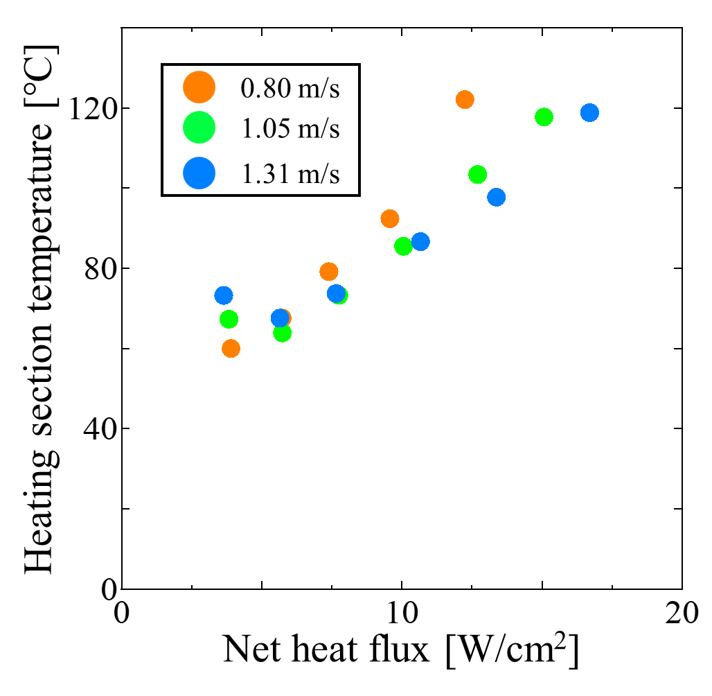 Figure 10 presents the heating section temperature for each air velocity condition, with the horizontal axis representing the net heat flux. Above 6.0 W/cm², the heating section temperature increased with heat load, but the rate of increase became more gradual at higher air velocity. At 1.31 m/s, the maximum allowable heat flux before the heating section temperature reached approximately 120°C was about 24% higher than that at 0.80 m/s, indicating improved tolerance to high heat flux conditions.