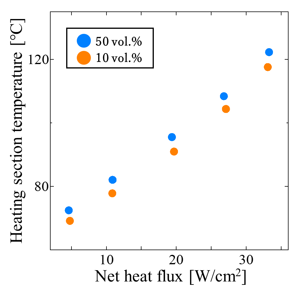 Figure 8 shows the heating section temperatures at different filling ratios under forced air cooling, where the air velocity of the fan was set to 0.80 m/s. The horizontal axis represents the net heat flux. The heat exchange section ratios were fixed at 20 area % for the heating section and 70 area % for the cooling section. As shown in the figure, at all heat inputs, the heating section temperature at 10 vol.% was lower than that at 50 vol.%, indicating better heat transport performance at the lower filling ratio. This is because, at 10 vol.%, latent heat transfer associated with phase change dominated the heat transport process, effectively suppressing the temperature rise in the heating section compared with the 50 vol.% condition.