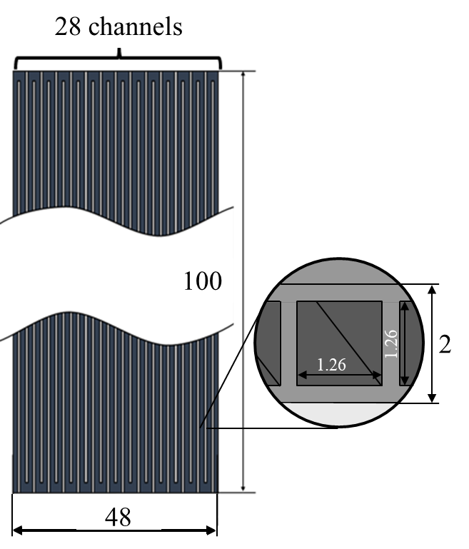 Figure 2 shows a schematic diagram of the test section and a detailed view of the channel cross-section. The test section was mainly made of aluminum and consisted of a flat tube with a total length of 100 mm, a width of 48 mm, and a thickness of 2 mm. The flow path had a meandering open-loop structure and comprised 28 square channels, each with a cross-section side length of 1.26 mm. The inner surface of the flow path was chemically treated to prevent the generation of non-condensable gases. The heating area ratio was fixed at 20 area %, while the cooling area ratio was varied. The figure illustrates the thermocouple positions for the case with a 50 area % cooling section. Thermocouples were installed along the longitudinal centreline of the MLFHP. The thermocouple positions changed according to the variation in the cooling area ratio. These measurement points were regarded as representative temperatures of the entire flow path and were used to evaluate the heat transport performance.