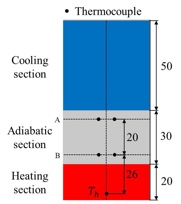 The measurement uncertainty of the temperature difference between the heating and cooling sections was at most ±18%, while that of the heater input power was ±0.42%. Therefore, the uncertainty of the thermal resistance was estimated to be ±18%. Neglecting the measurement uncertainty of the heating and cooling surface areas, the uncertainties of the temperature difference between the heating and insulating sections and between the insulating and cooling sections were estimated to be at most ±20% and ±8%, respectively. Consequently, the uncertainties of the evaporation and condensation heat transfer coefficients were estimated to be ±20% and ±8%, respectively.