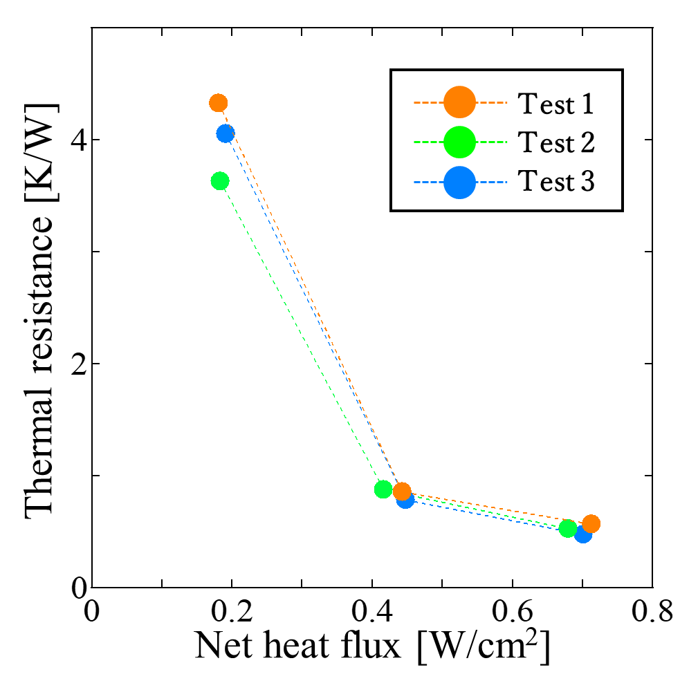 Figure 5 shows the thermal resistance obtained from three repeated experiments conducted under identical conditions to verify the reproducibility of the heat transport performance of the MLFHP. The horizontal axis represents the net heat flux, which was calculated by dividing the net heat input by the heating area. The heat exchange section ratio was set to 20 area % for the heating section and 50 area % for the cooling section. As shown in the figure, a slight variation was observed around a net heat flux of 0.2 W/cm², whereas the difference in thermal resistance among the three experiments decreased at net heat fluxes above 0.2 W/cm². This indicates that the reproducibility of the MLFHP improved with increasing net heat flux.